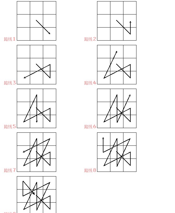| 上述九宫飞泊只是说明其行进路线而已,如果运用得熟悉后,就不必再背口诀了。 | |||||||||||||||||||